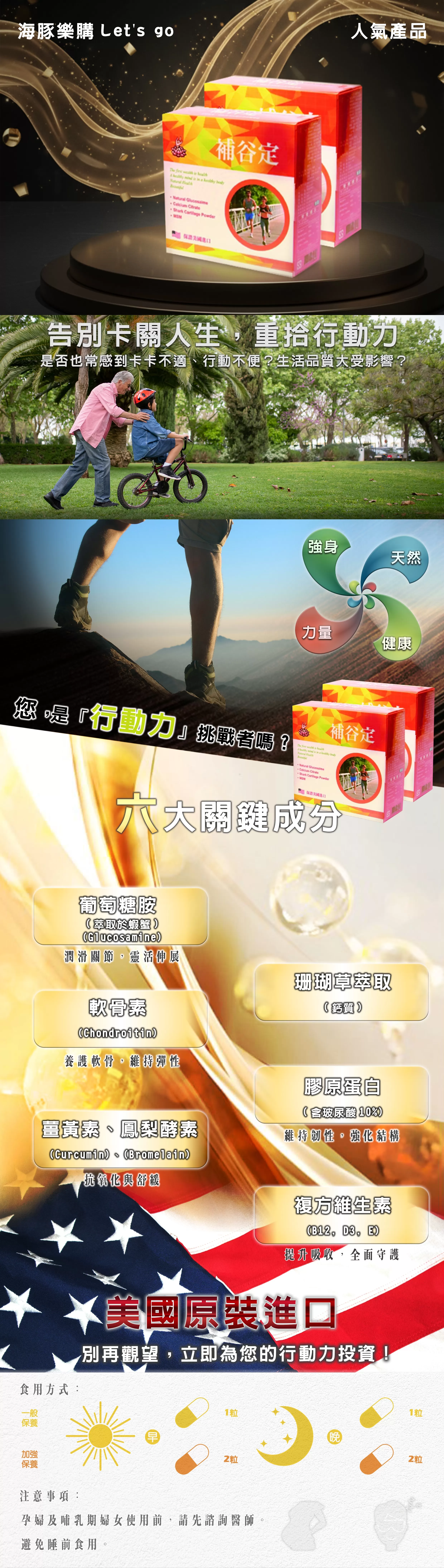 ✔️葡萄糖胺(來自蟹殼)、檸檬酸鈣、鯊魚軟骨素、甲基硫醯基甲烷、雞膠原蛋白(包含玻尿酸10%)、魚膠原蛋白、鳳梨酸素、葡萄子萃取、貓爪藤萃取(根)、薑黃根萃取、亞麻仁油、松樹皮萃取物、大豆卵磷脂、維生素E(乙酸dl-α-生育醇酯)、維生素B12(氰鈷胺明)、膽鈣化醇(維生素D3)。
