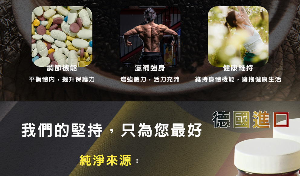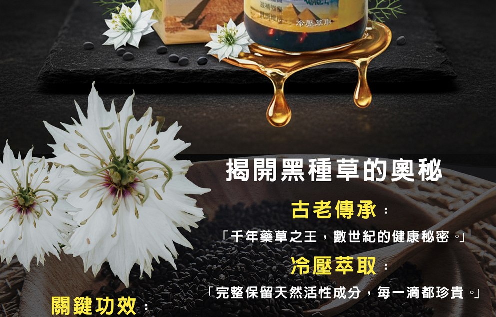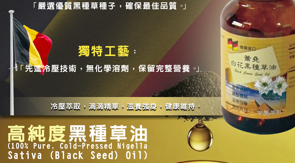 【食用方式】:每日2~3次,每次2~3粒。 【內容量】: 每瓶120顆。 【主要成份】:黑種草。 【介紹】: 源自德國的珍貴獻禮,高品質冷壓初榨黑種草油,是專為追求平衡的現代人所打造。 本品能幫助您調整體質、調節生理機能。面對季節與環境的挑戰時,協助建立一道由內而外的健康屏障,維持順暢清新。 對於享受美食也注重健康的您,它能促進新陳代謝,是餐後維持穩定的好夥伴。 每日補充,不僅是滋補強身的營養補給,更能維持身心的平靜穩定,讓您膚質由內而外散發光采,從容應對每一天的挑戰。