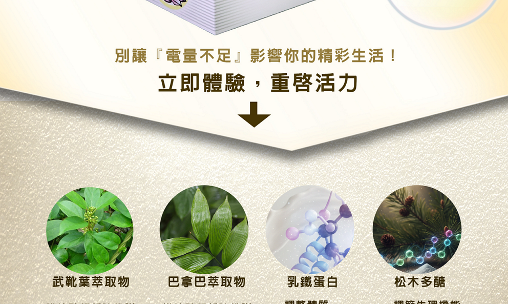 【產品介紹】:專為步調快速、身兼數職的現代人設計。當您需要長時間保持專注與清晰思緒時,本品能為您增強體力、提振精神。其中豐富的營養素有助於促進新陳代謝,是您在享受美食後維持平穩的好選擇,更是中老年人及素食者絕佳的營養補給來源,幫助您從容應對生活的每一項挑戰。