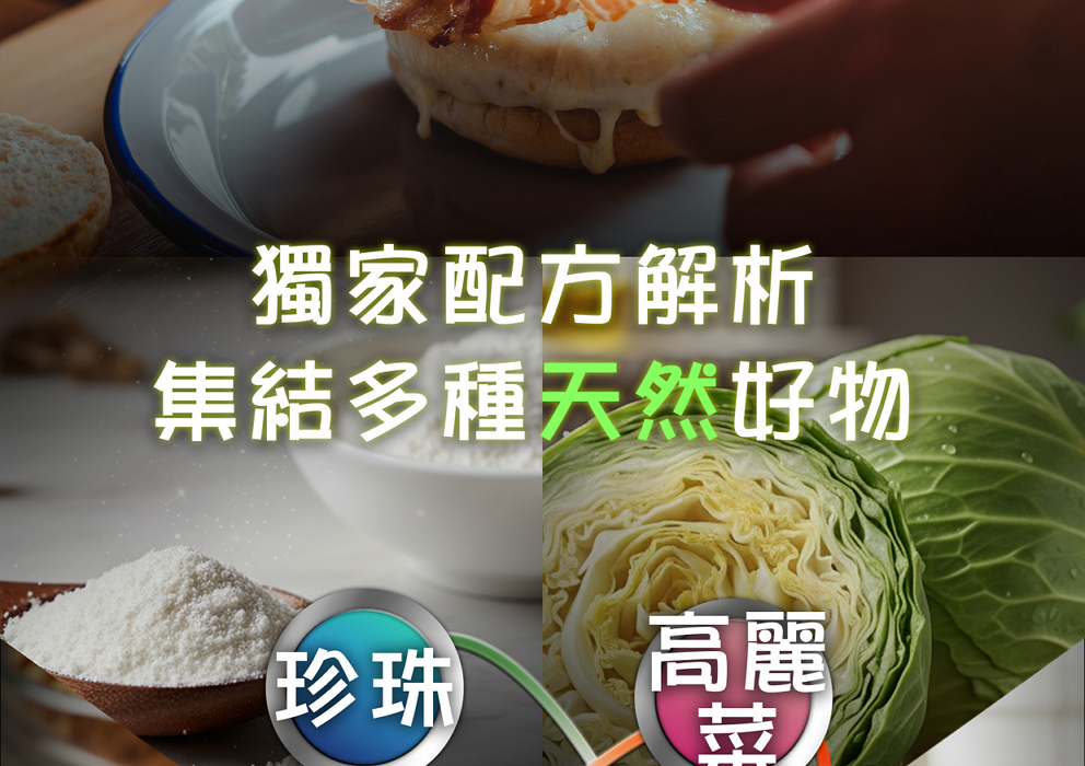 【主要成份】:高麗菜萃取物、大豆發酵萃取物、珍珠粉、鳳梨萃取物、蘋果纖維、牛蒡萃取物、非基改玉米澱粉、葫蘆巴子萃取物、二氧化矽、硬脂酸鎂。