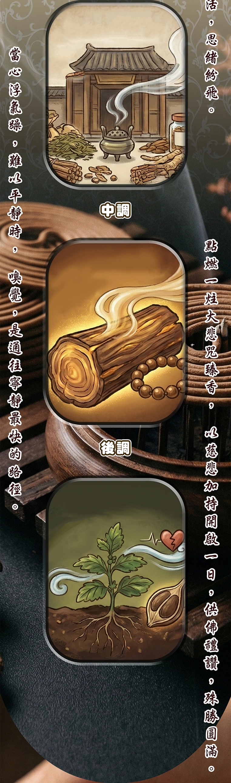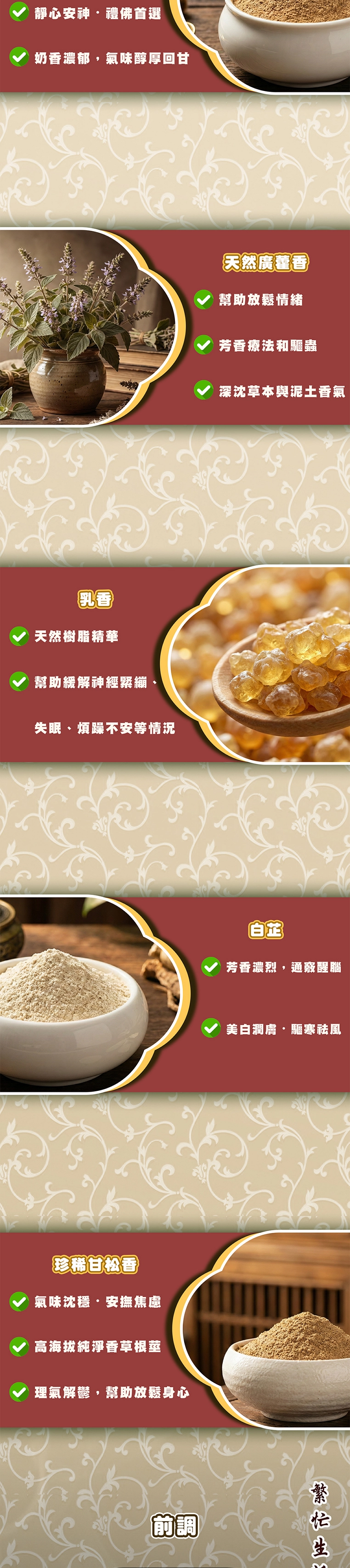 【產品定位】: 慈悲加持、修身養性、供佛首選 【核心成份】: 老山檀粉、廣藿香、乳香、白芷、甘松香 【核心功效】: 老山檀 (入定):幫助大腦進入放鬆的Alpha波狀態,非常適合誦經、打坐。 漢方合香 (大悲願力):數種藥香合一,輔助修身養性。