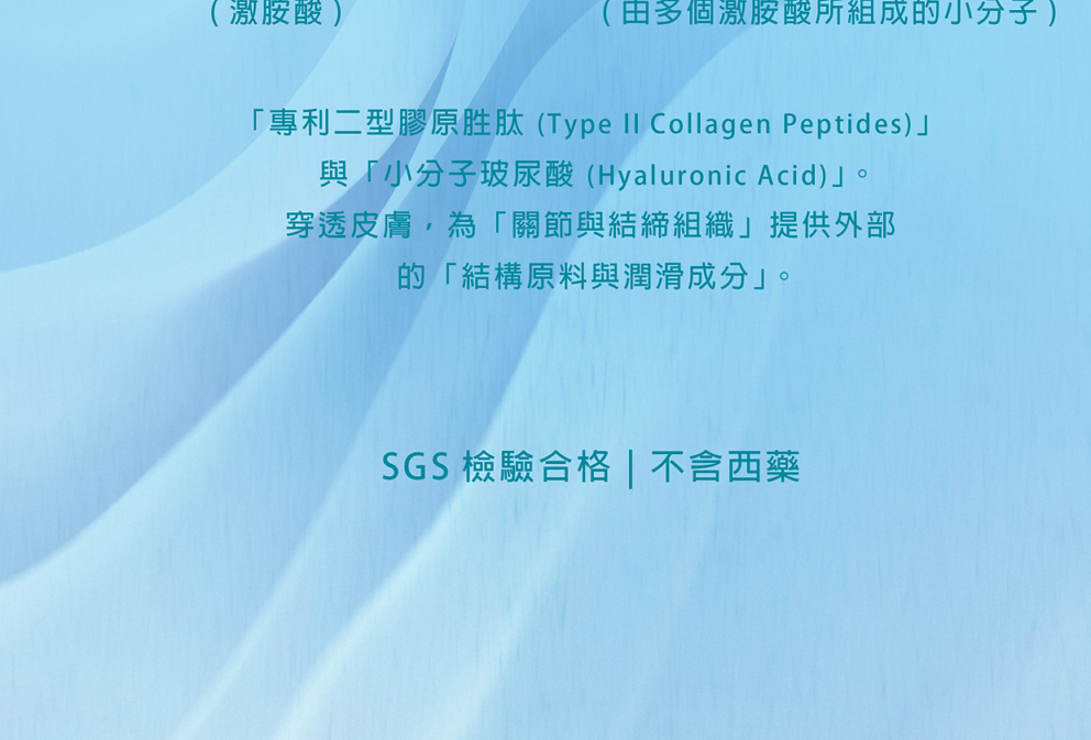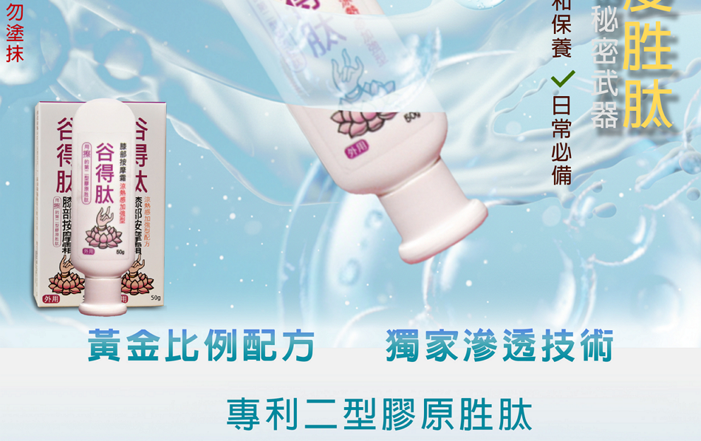 「谷得肽膝部按摩霜」採用黃金比例配方,含有珍貴的專利二型膠原胜肽。獨特的小分子滲透技術,搭配按摩能快速吸收,帶來溫和舒適的舒緩感受,是您維持靈活順暢的日常保養秘密武器!